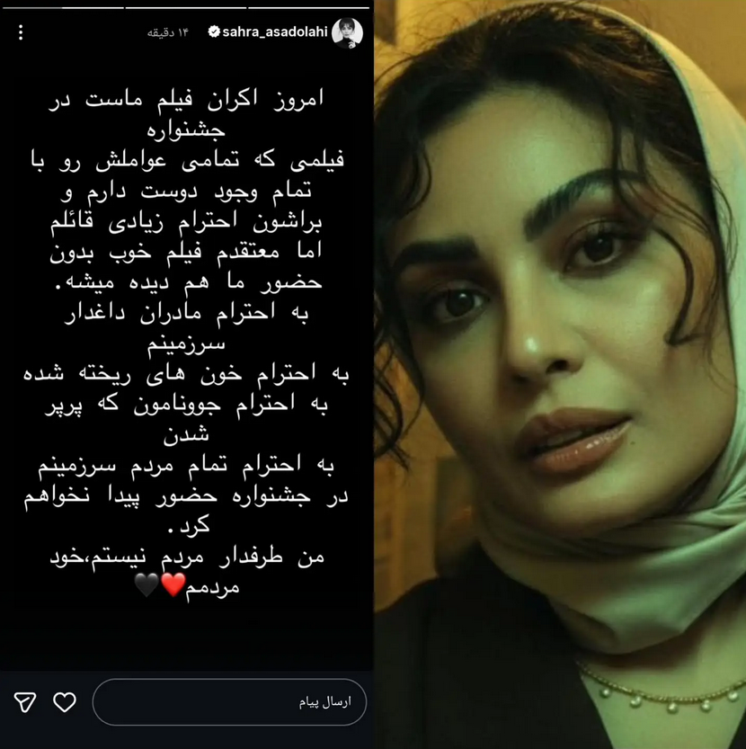 صحرا اسداللهی بازیگر سینما با انتشار یک استوری اعلام کرد که بهخاطر همدردی با مردم از حضور در جشنواره فجر انصراف میدهد.