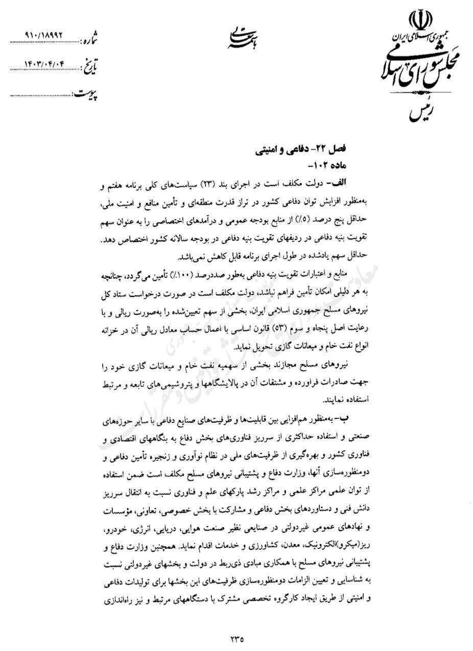 در این نامه آمده است: "ستاد کل نیروهای مسلح به منظور تحکیم دفاع از استقلال تمامیت ارزی کشور استفاده از ظرفیتهای ملی و ایجاد انگیزه لازم برای جوانان در انجام خدمت وظیفه و رشد و تعالی و توانمندسازی و افزایش مهارتهای آنها در طول سالهای اجرای برنامه نسبت به کاهش مدت سربازی به میانگین ۱۴ ماه با احتساب مدت آموزش و جایگزینی سایر عضویتها با تامین منابع پایدار توسط دولت تعیین تکلیف مشمولان غایب و دانشجویان مشغول به تحصیل در دانشگاههای معتبر خارج از کشور که به تایید وزارتخانههای علوم، تحقیقات و فناوری و بهداشت، درمان و آموزش پزشکی و شورای عالی حوزههای علمیه میرسد با رعایت ماده ۴ قانون خدمت وظیفه عمومی اقدام نماید.