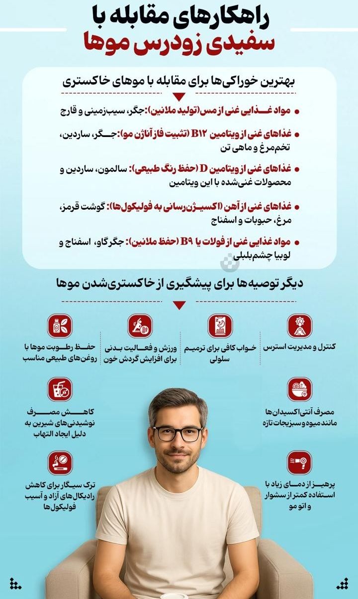 به گزارش هفت صبح سفید شدن زودهنگام موها معمولاً به کمبود مواد مغذی، استرس اکسیداتیو و عوامل ژنتیکی مرتبط است. کمبود برخی ویتامینها و املاح، تولید ملانین را کاهش و استرس اکسیداتیو فولیکولها را افزایش میدهد. اصلاح رژیم غذایی و سبک زندگی میتواند به حفظ رنگ طبیعی مو کمک کند.