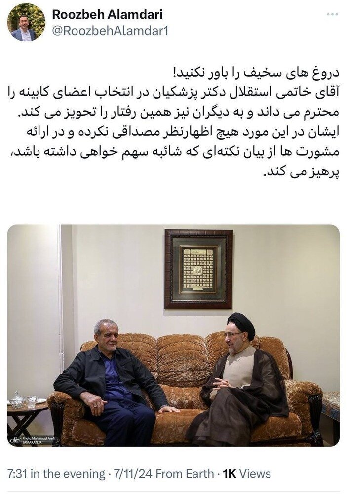 آقای خاتمی استقلال دکتر پزشکیان در انتخاب اعضای کابینه را محترم میداند و به دیگران نیز همین رفتار را تجویز میکند.