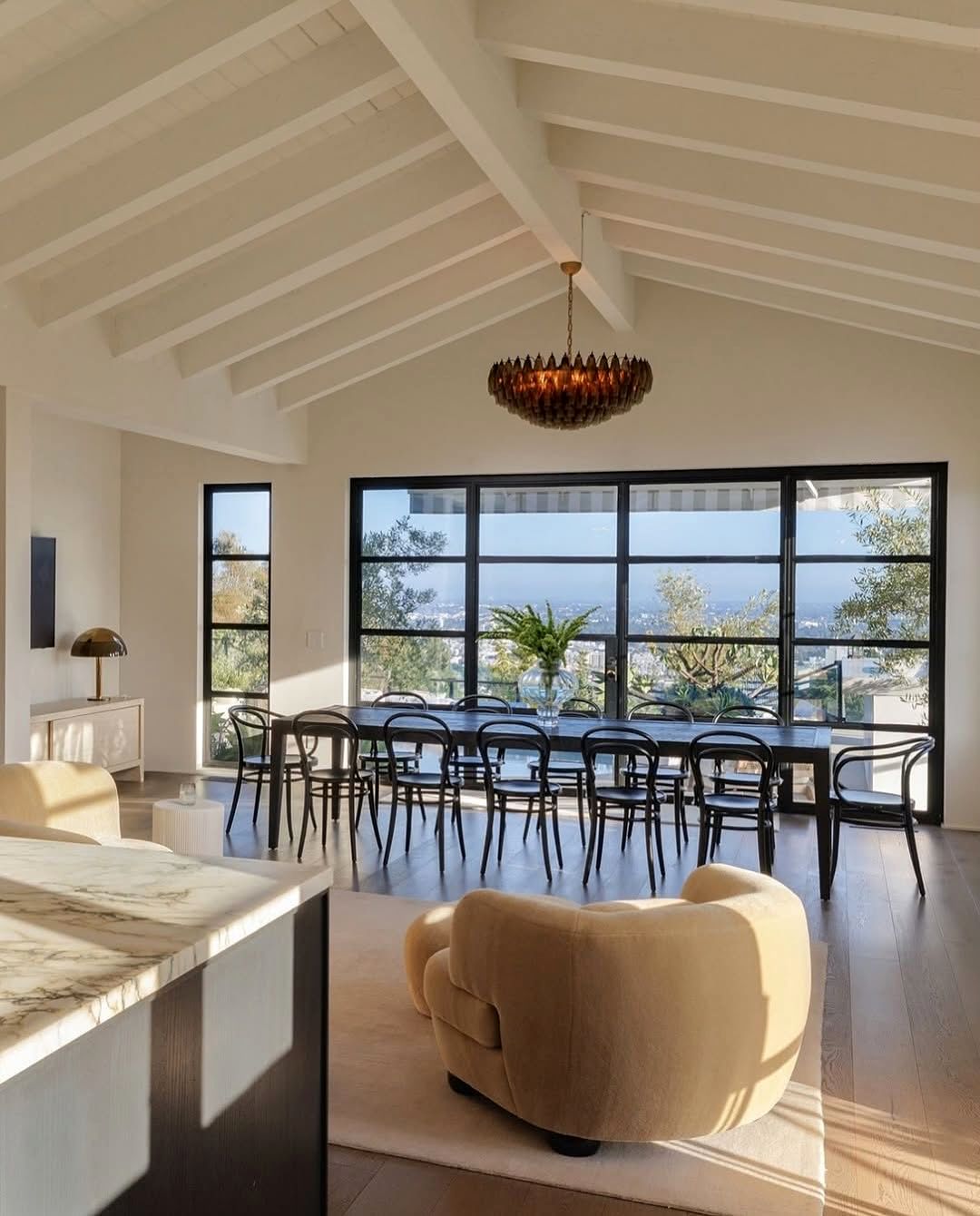 یک سالن غذاخوری دنج و فضایی برای نشستن کنار شومینه، به آشپزخانهای شیک و مجهز وصل میشود؛ آشپزخانهای با کابینتهای آبنوسی و لوازم خانگی لوکس که جلوهای مدرن به فضا داده است.