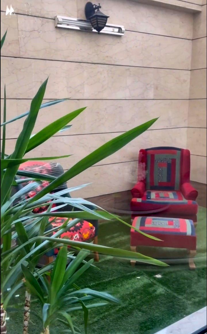 در گوشهای از خانه یک پاسیو و نورگیر وجود دارد که با قرار دادن یک گلدان بزرگ سبزی و نشاط را به خانه آورده است. جالب است که برای مبلمان فضای پاسیو هم از رنگ و طرح تقریبا سنتی با رنگ سبز و قرمز انتخاب شده است. کفپوش چمن مصنوعی فضای سبز آن را کامل کرده است.