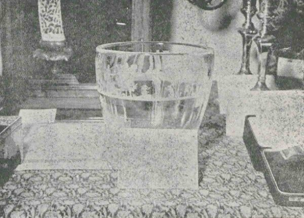 ولی از همان جنس کریستال گلدان است تصاویری نقش کردهاند. وزن گلدان در حدود سه کیلو