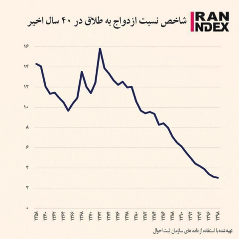 روزنامه هفت صبح | ‌نمودار جدیدی که از نسبت ازدواج به طلاق طی ۴۰ سال گذشته منتشر شده نکات جالب زیاد دارد مثل اینکه قبل از وقوع انقلاب اسلامی‌نسبت ازدواج به طلاق ۱۴ به یک بوده است بعد از آن برای چند سال روند کاهشی پیدا می‌کند و این روند نزولی تا سال ۱۳۶۵ ادامه داشته و به ۹ ازدواج در برابر یک طلاق می‌رسد. از این سال دوباره نسبت ازدواج به طلاق صعودی می‌شود آن هم به مدت سه سال تا اینکه در سال ۱۳۶۸ به ۱۳ ازدواج در برابر یک طلاق می‌رسد.